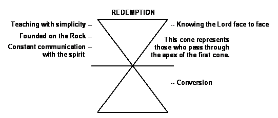 Cone which represents Apex of the cone through /\ man’s progress in the gospel. / \ which a man must pass to / \ become converted–to reach / \ this he is aided by the / \ Lord. / \